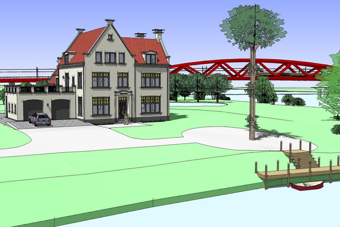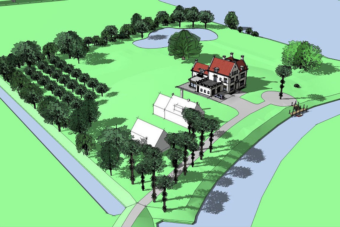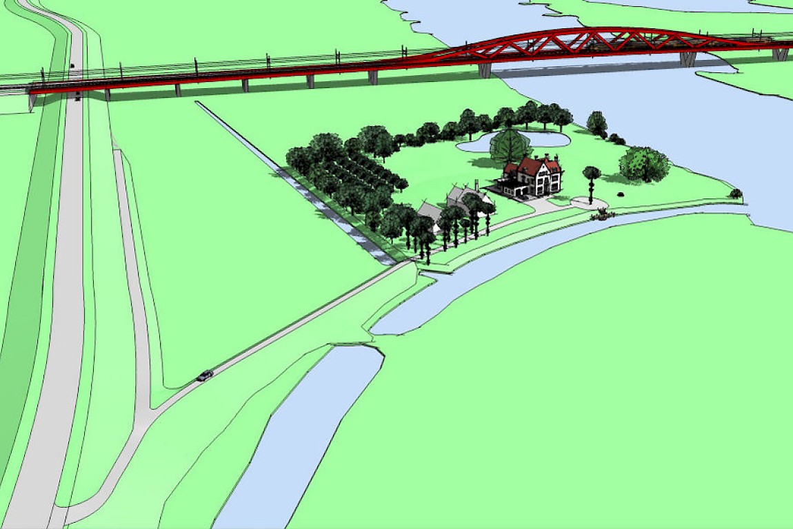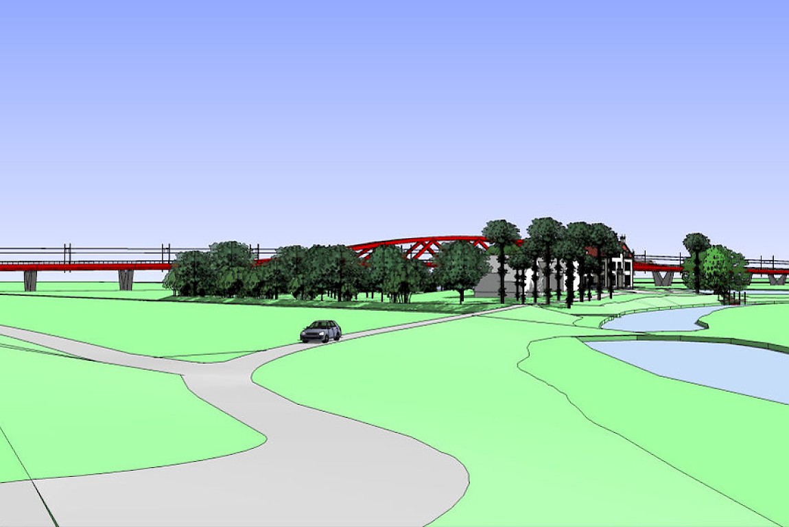 Overzicht van het terrein met nieuwe brug op de voorgrond